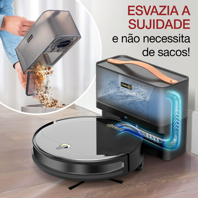 CLEAN & GO é o futuro dos Robots de Limpeza, com o qual não terá de fazer absolutamente nada. Porque quando acaba o seu trabalho (aspira e esfrega ao mesmo tempo com resultados impecáveis), volta à sua base de carga com depósito de grande capacidade incorporado e esvazia-se sozinho! Para que esqueça a incómoda tarefa de esvaziar a sujidade durante 2 meses! Além disso, como pode programá-lo, (quase) não dará por ele. Já pensou em todo o tempo que vai ter para si? E, como já não terá de comprar sacos, poupará dinheiro e também cuidará do meio ambiente. Com filtro duplo - 1 HEPA antialergias - é silencioso - poderá ver televisão ou ler enquanto ele está a limpar e nem o notará - e muito fácil de usar a partir do seu comando à distância ou da APP gratuita… Se ainda não tem um Robot de Limpeza, CLEAN & GO é a melhor opção pela sua excelente relação qualidade-preço. E, mesmo que já tenha um Robot, merece “dar o salto” para um que faça realmente tudo por si!