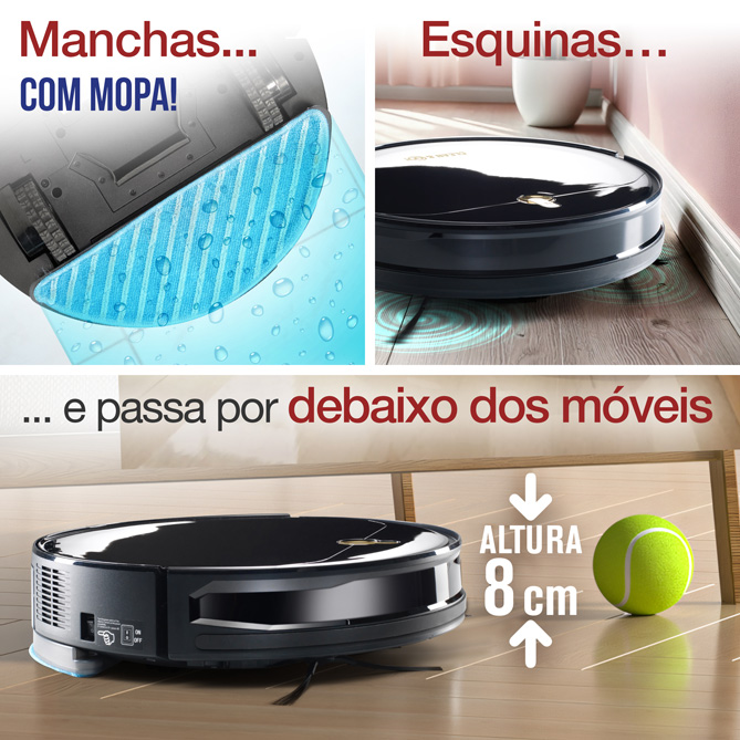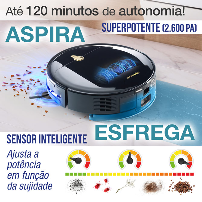 Com design “2 em 1” (aspira ao mesmo tempo que esfrega, com o seu depósito para água e a mopa de microfibra na base), grande potência de sucção (2.600 Pa, muito maior do que outros robots da sua categoria) e escovas laterais que “empurram” a sujidade na direção da zona de aspiração, CLEAN & GO chega até ao último recanto - rodapés, esquinas, bordas dos móveis… - e também penetra nos tecidos mais difíceis. Garantido: resultados brilhantes, mesmo em casas com animais que enchem tudo de pelos! E, se pensa que com tanta potência a bateria se vai esgotar rapidamente, verificará que não é assim: CLEAN & GO tem uma autonomia de 120 minutos ou 120m2 - mais do que suficiente para uma limpeza a fundo de uma vivenda grande numa só sessão!