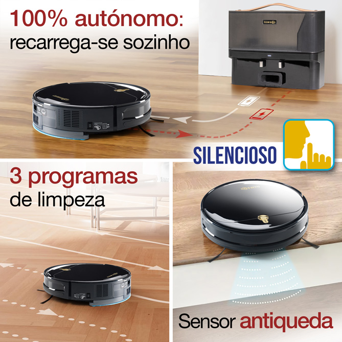 A tecnologia de CLEAN & GO tornará a sua vida mais fácil. Basta escolher um dos seus 3 modos (automático, esquinas e espiral) e já está! Muito silencioso, passa por baixo de móveis e sofás - graças ao seu design extrafino de apenas 8 cm de altura - sobe tapetes, contorna obstáculos, deteta automaticamente o nível de sujidade e faz várias passagens onde é mais necessário, limpa todas as superfícies sem danificá-las, possui sensores antiqueda (para casas com escadas) e anticolisão… E, quando acaba, volta para a sua base de carga, esvazia de forma autónoma a sujidade que recolheu e fica preparado para voltar a trabalhar por si, quando desejar!