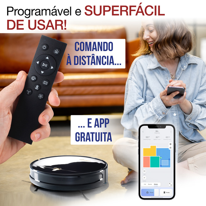 A partir do comando à distância incluído ou do seu smartphone com a APP gratuita, poderá controlar todas as funções de CLEAN & GO: mais rápido, simples e eficaz, é impossível!