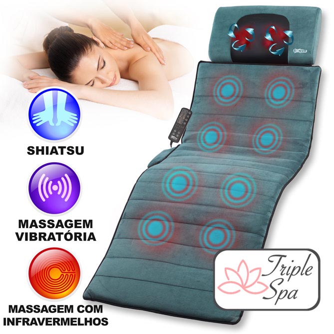 O stress e o cansaço fazem parte do seu dia a dia? Diga-lhes adeus com o Sistema de Massagem Triple SPA. O primeiro sistema terapêutico do mundo que combina os incríveis efeitos da terapia vibratória, da massagem com infravermelhos e da massagem ultra shiatsu, e usá-lo é muito fácil! Basta reclinar-se para desfrutar em sua casa do sistema de massagem que vai mudar a sua vida.